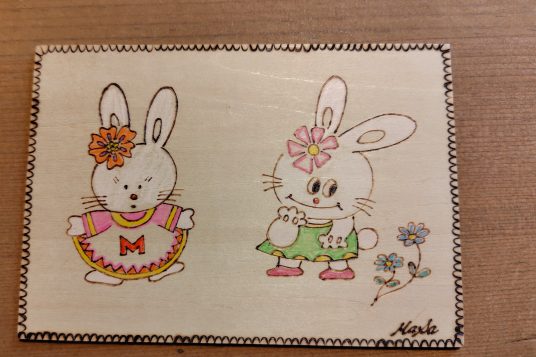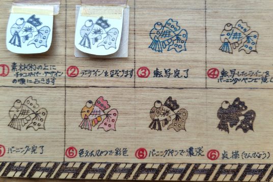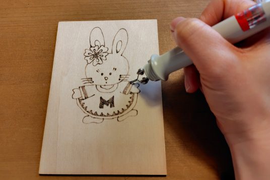 電熱ペンを使って木を焦がしながら描くウッドバーニング。